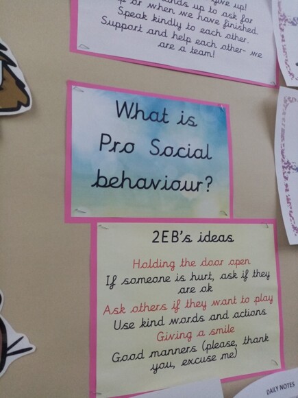 ''Being kind and sensible and not being disrespectful or rude to a teacher or anyone.It also means having a good attitude and behaviour.It's a good skill to find out how to be pro-social because later in life you can have that amazing skill to be positive and kind''