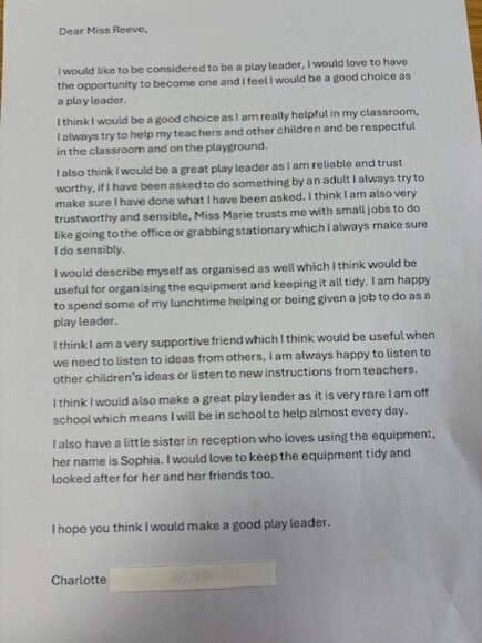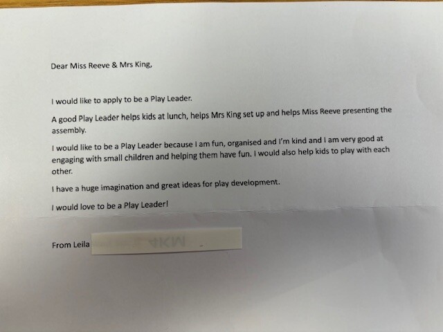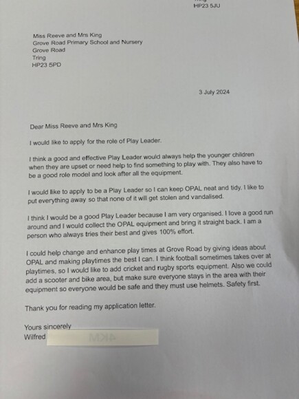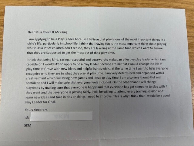 We have appointed 'Play Leaders' from Year Six to help support, organise and monitor play at Grove Road. This year our Play Leaders are: Charlie, Natalie, Madeline, Isla S, Sasha, Charlotte, Hattie, Melody, Millie L, Lilia and Lily M.